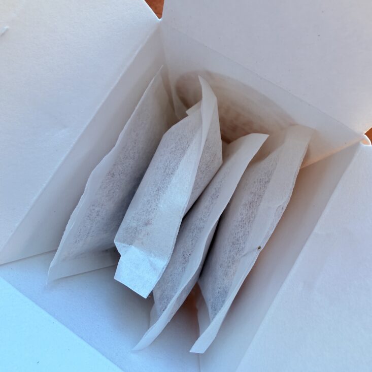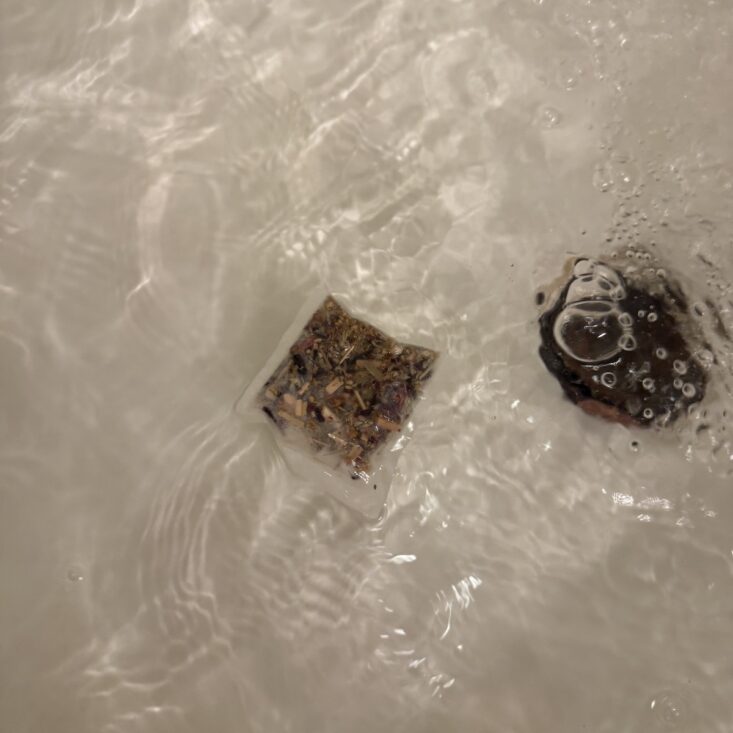 Inside are four small pouches containing a blend of lavender, rose, hibiscus, chamomile, orange peel, and lemongrass. With its soothing, tea-like aroma, it’s both earthy and sweet—the perfect mix for a soak after an especially stressful day.