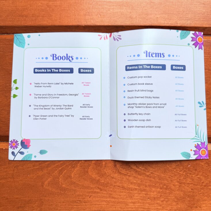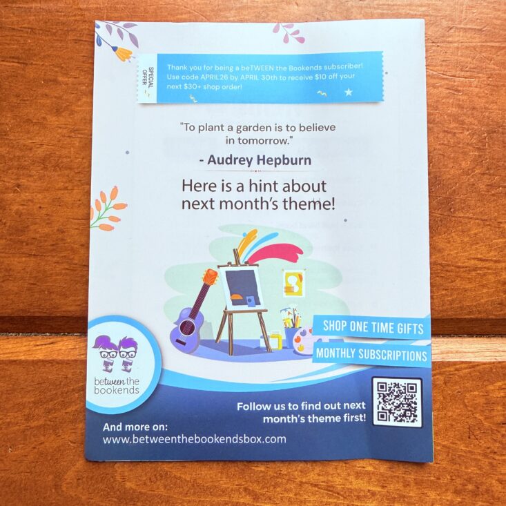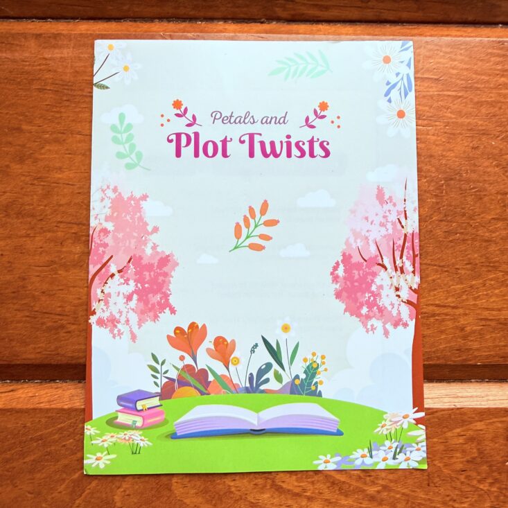 To start off the box, we look through the included pamphlet. It describes the month’s theme and lists the contents of every beTWEEN the Bookends version. This little booklet gives us a clear overview of what’s inside the box, along with a bookish quote, social media information, and a hint about next month’s theme. This month’s quote reads: "To plant a garden is to believe in tomorrow." - Audrey Hepburn