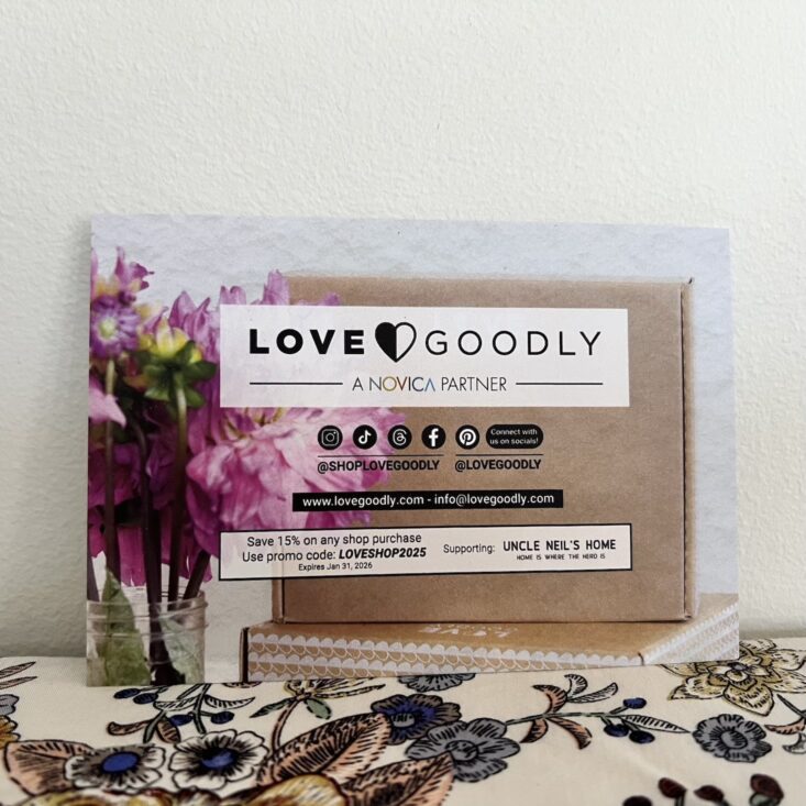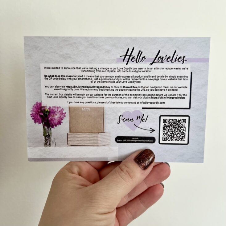 Love Goodly included a postcard listing all of their social media and a discount code for subscribers to use in their shop. On the flip side, you'll find a QR code that takes you to their website, where you can view the current box's contents, including a description of each product, its star ingredients, and how to use each item.