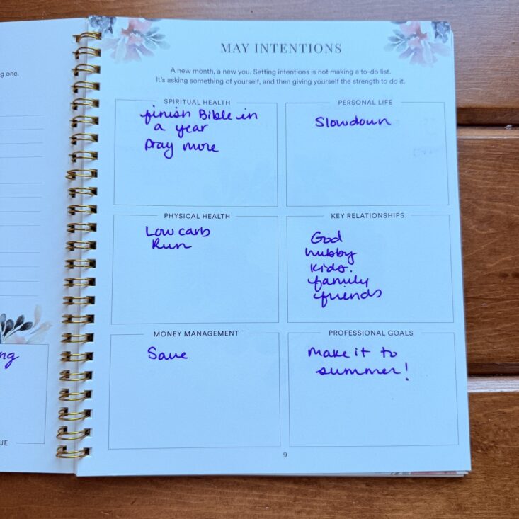 I love that this journal always starts on a Monday, even if that means beginning in the previous month. This month started on Monday, April 27th, so I got a jump start! When it comes to the journal as a whole, I tend to spend most of my time on these calendar pages. With sections for meal plans, to-dos, habits and activities, shopping lists, and daily schedules, I write everything here. It keeps me on track each day and gives me that satisfying feeling of accomplishment—there’s truly nothing better than crossing an item off my list. I also appreciate the extra touches these pages include. While I don’t always fill out how I want to feel each week, this week I found it really helpful to write it down and pray over it. This journal is just so darn helpful!