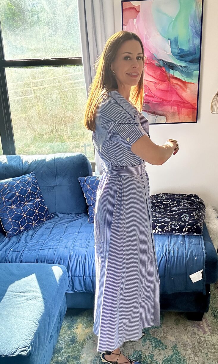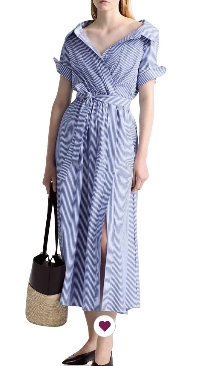 Size & fit: The Lydia relaxed midi dress does exactly what it promises: it's relaxed, but intentional. Crisp cotton, subtle pinstripes, pockets, and an elastic waist with a self-tie belt that lets you decide how defined you want the moment to be.