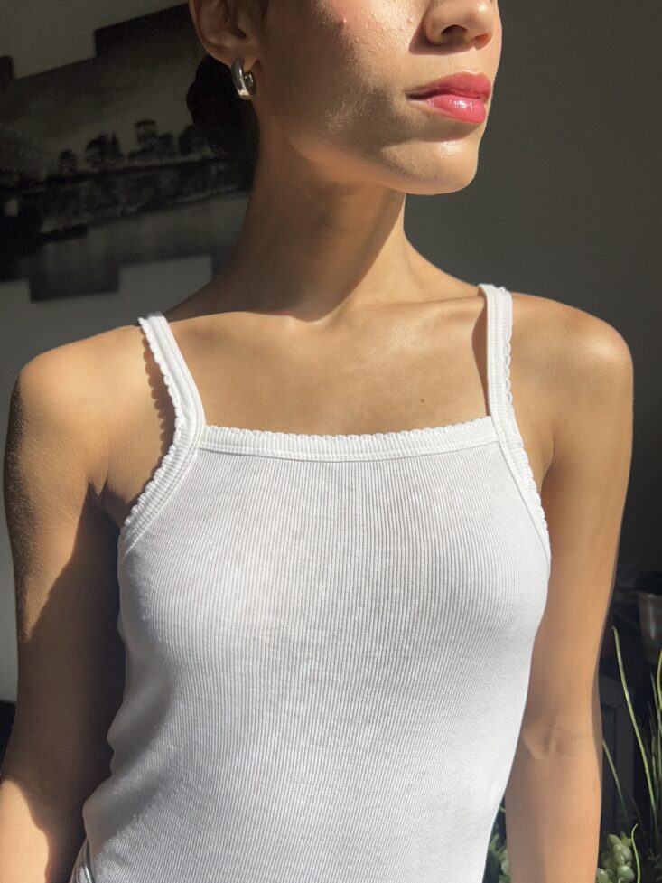 I wore my CAKES on a hot day in a white ribbed tank. Tight fabric, zero room for mistakes. Not only did they disappear under my top thanks to their infinity edge design, I forgot I was wearing them. They’re soft, breathable, and move with your body — no poking, peeling, or plasticky feeling.