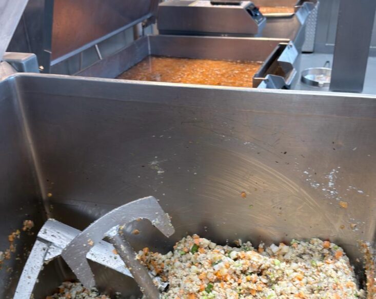 We watched whole ingredients being prepped right in front of us: chicken breasts trimmed by hand, fresh vegetables chopped, rice cooked in large pots. Everything was weighed, gently cooked, and assembled by an on-staff chef.