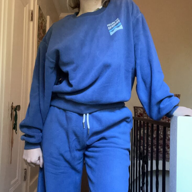 I knew this sweatsuit looked cozy as ever on the model, but I wasn't prepared for just how snuggly it would feel on my body. New WFH uniform unlocked. This navy blue set is fully fleecey both inside and out, with a cute carefree graphic on the back.