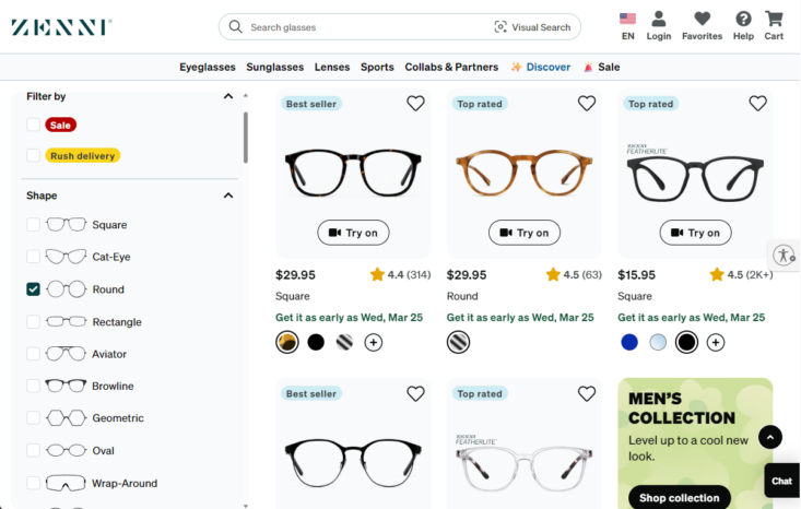 I started by browsing Zenni's frame collection. The filter panel was the key – I narrowed by shape, size, material, and price, and went from an overwhelming wall of options to a short, manageable list in minutes.
