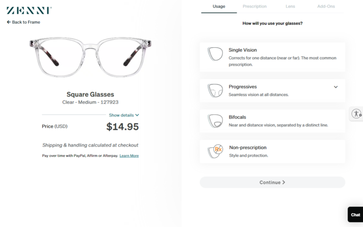 Once I picked a frame, I clicked Select Lenses. The first screen asked: How will you use your glasses? The options are Single Vision, Progressives, Bifocals, Reading, and Non-prescription. I picked what matched my prescription and hit Continue.