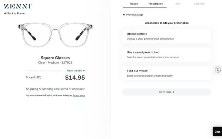Zenni gives you three ways to add your prescription: upload a photo of it, use a saved prescription from your account, or fill it out manually. I chose Fill it out myself.