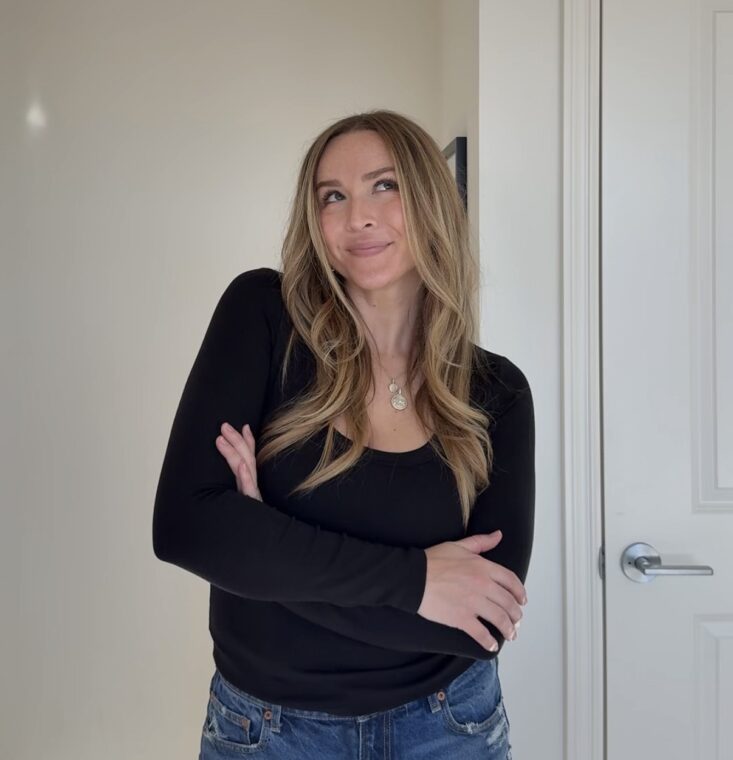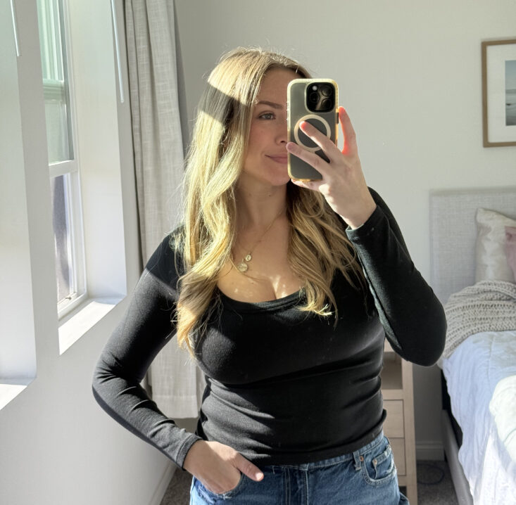 This is where the everyday comfort really shines. The soft, stretchy fabric moves with you, whether you’re running errands, filming content, or sitting at your desk for hours. It’s comfortable enough to lounge in but fitted enough that the outfit still feels intentional. It’s the kind of top that makes casual outfits look styled instead of sloppy.