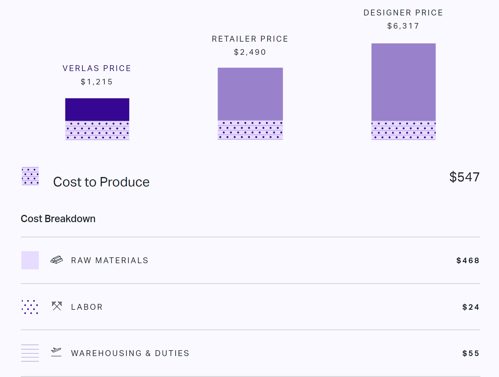 Breakdown of the production costs for a Verlas piece of jewelry in comparison to retailers and designers.