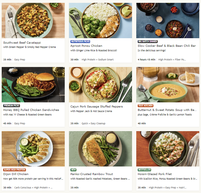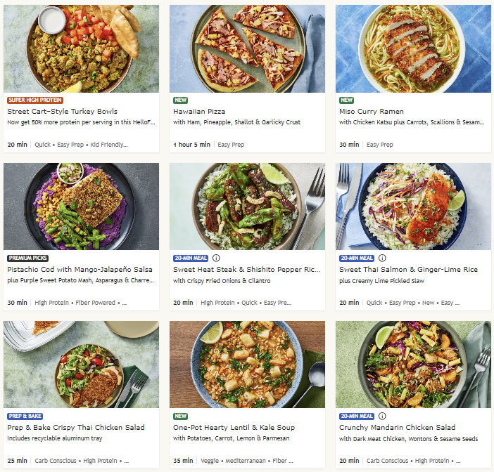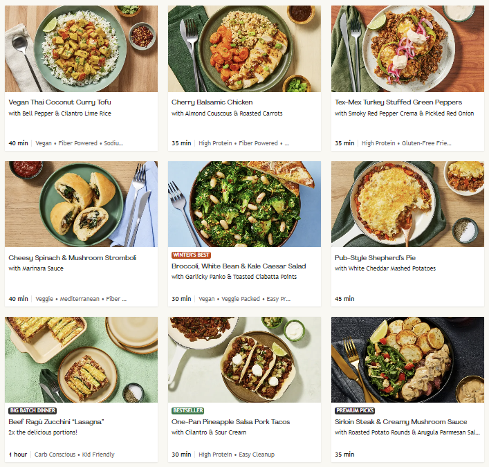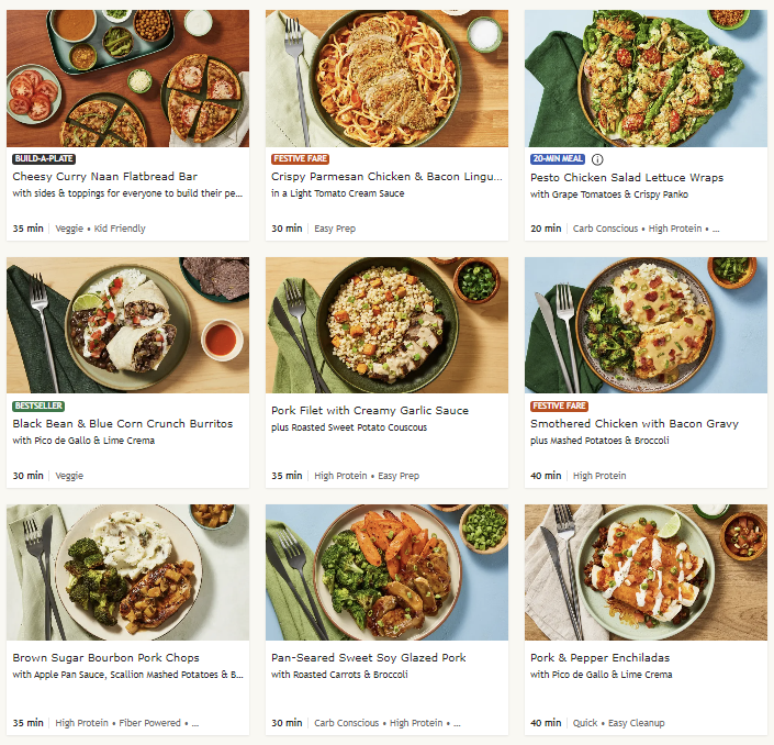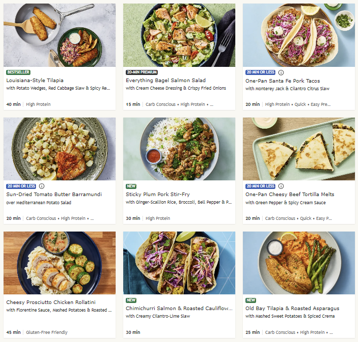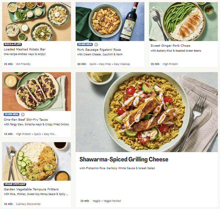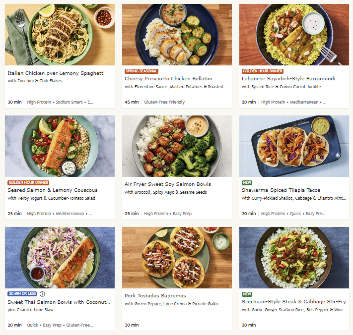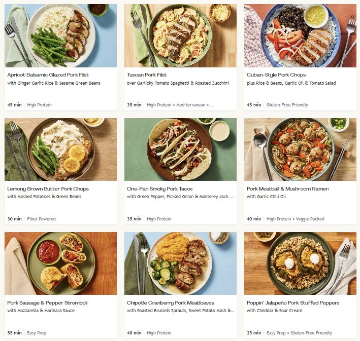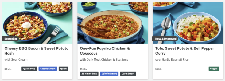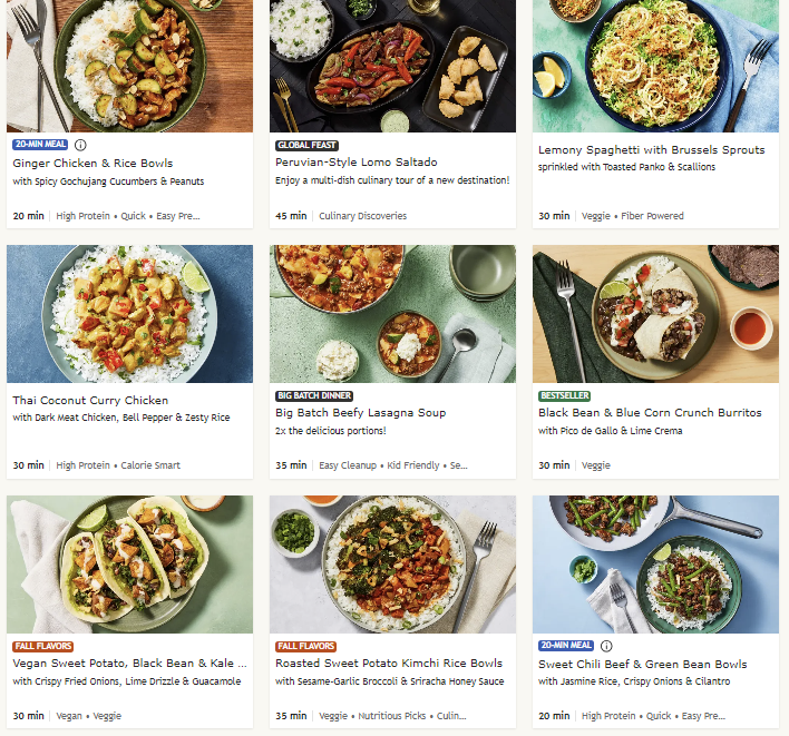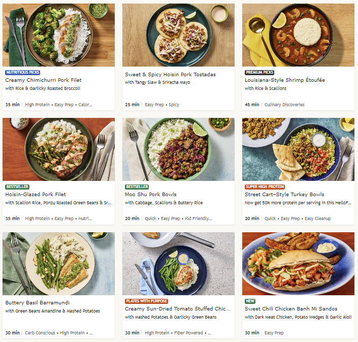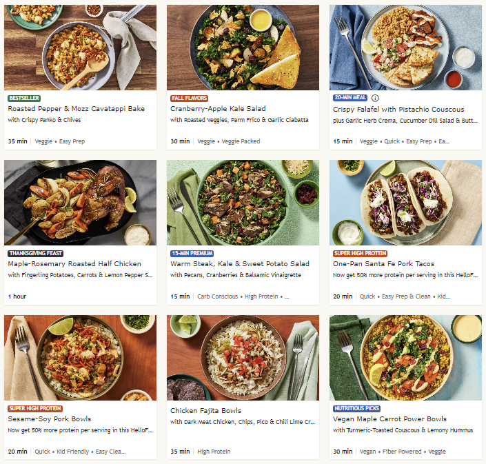 About this Meal Kit: HelloFresh offers quality pre-portioned ingredients and easy-to-follow recipes that you can choose week-by-week. Their plans include Veggie, Meat & Veggie, Low-Calorie, and Family-Friendly, and their menu rotates weekly.