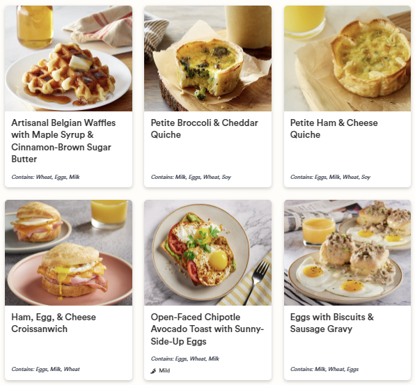 - Eggs with Biscuits & Sausage Gravy, Contains: Milk, Wheat, Eggs