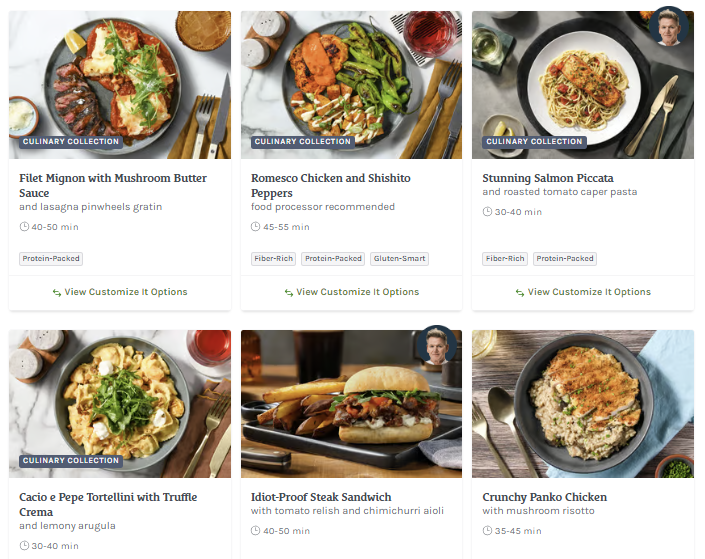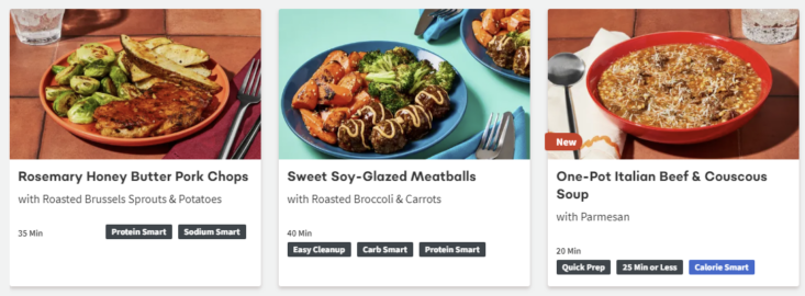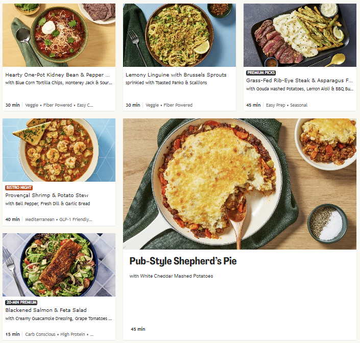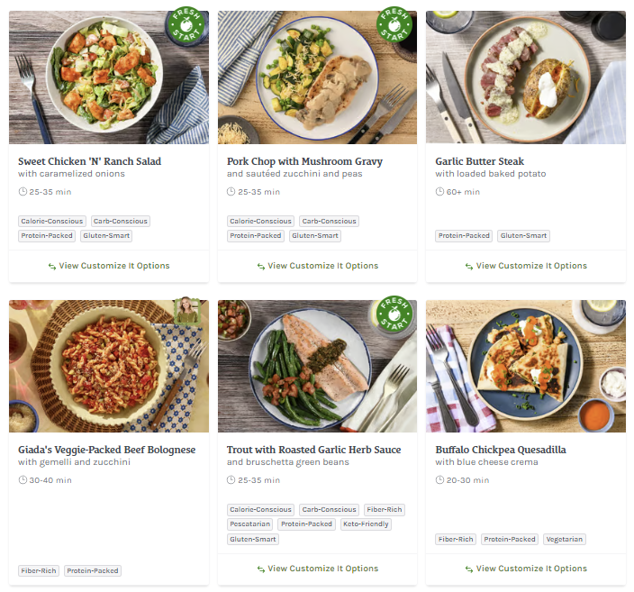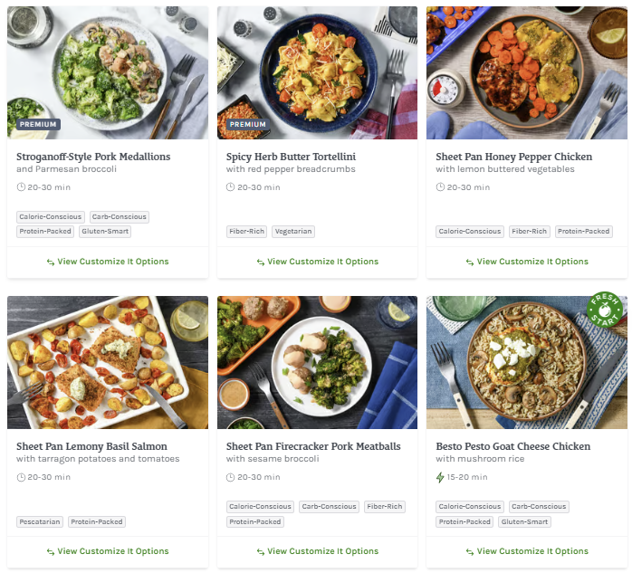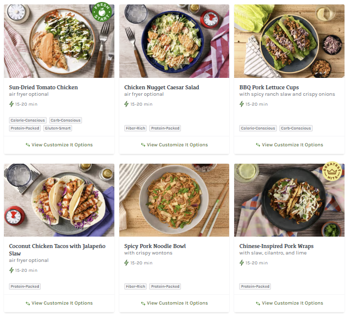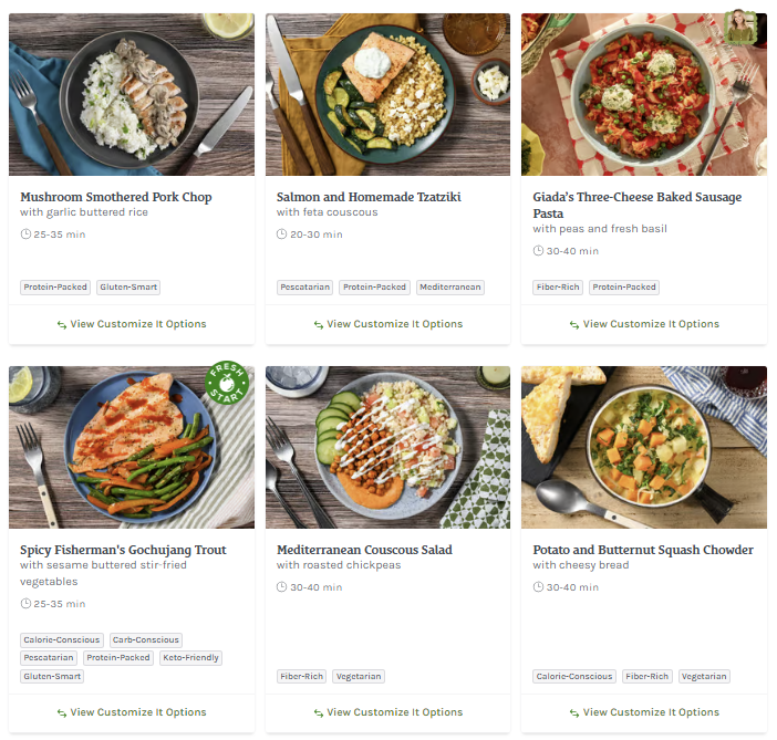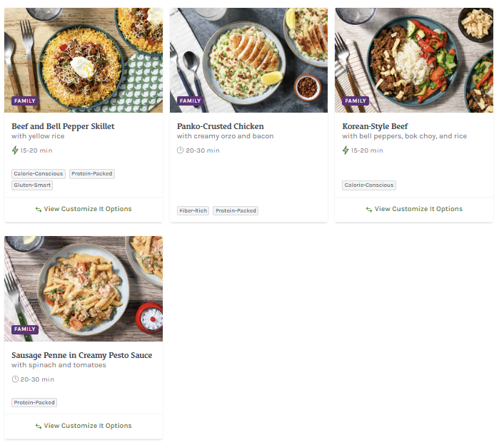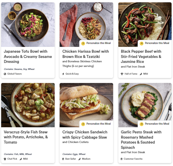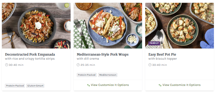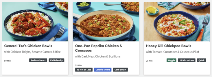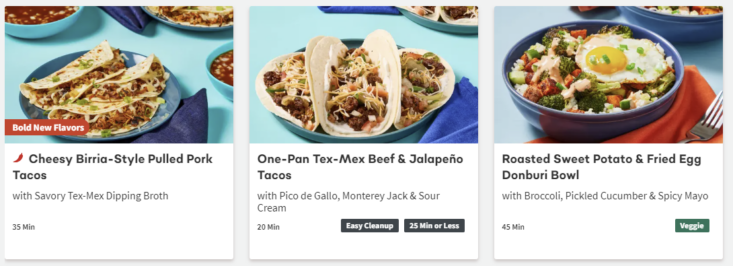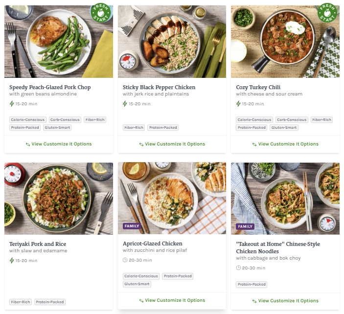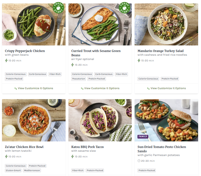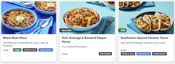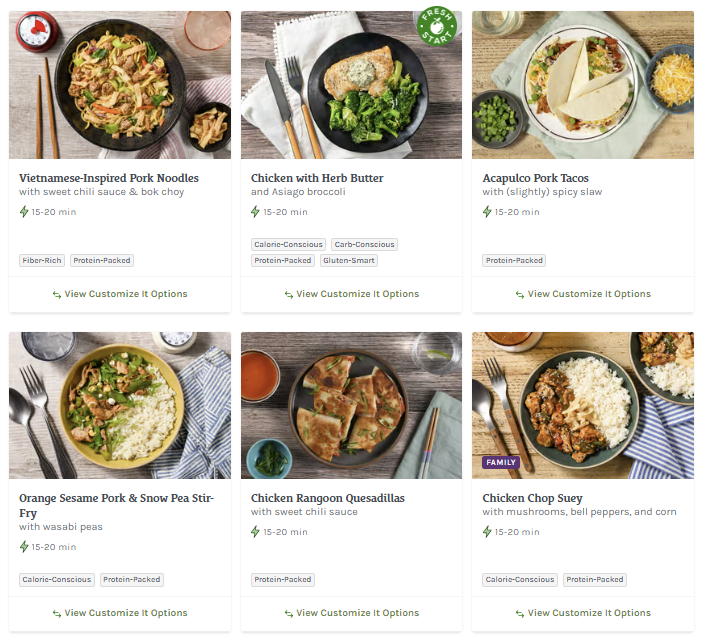 About this Meal Kit: Home Chef is a meal kit subscription that delivers a weekly box of the pre-portioned ingredients needed to make two to six meals that feed two, four, or six people. Recipe cards are easy to follow, and meals can be made in about 30 minutes. For those with dietary restrictions, Home Chef points out recipes that are calorie-conscious, carb-conscious, and vegetarian. Picky about your protein? Most meals allow you to customize whether recipes include chicken, steak, or seafood; some recipes can even be made vegetarian-friendly by opting for Impossible (meatless) meat!