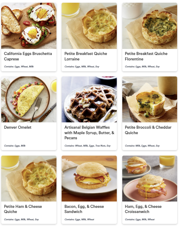 - Bacon & Egg Breakfast Sandwich, Contains: Eggs, Milk, Wheat, Soy